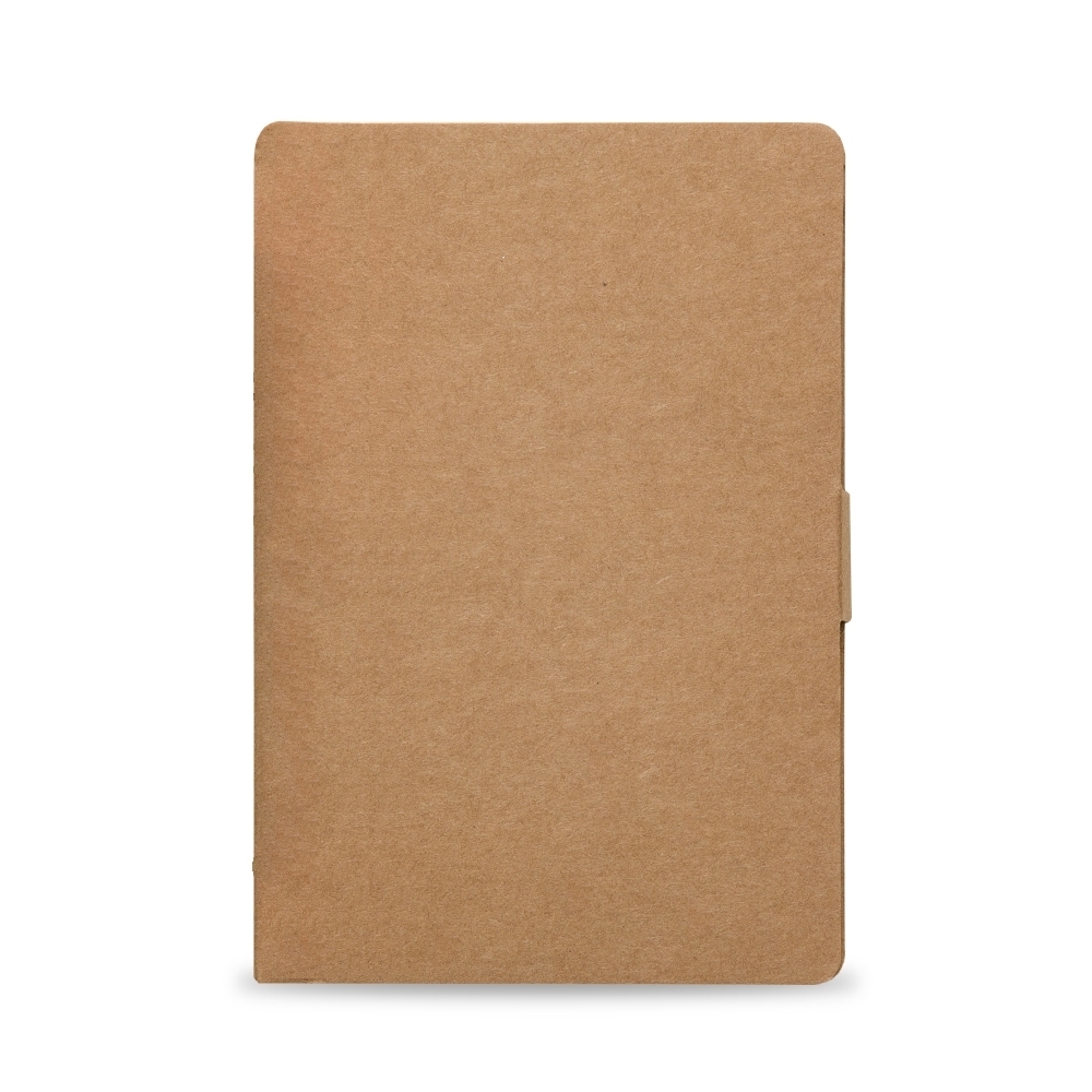 Bloco de anotações ecológico, material em kraft. Possui uma trava na própria capa, cinco blocos autoadesivos coloridos com aproximadamente 25 folhinhas , bloco autoadesivo amarelo com aproximadamente 25 folhas e bloco grande com aproximadamente 70 folhas.