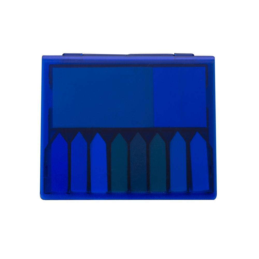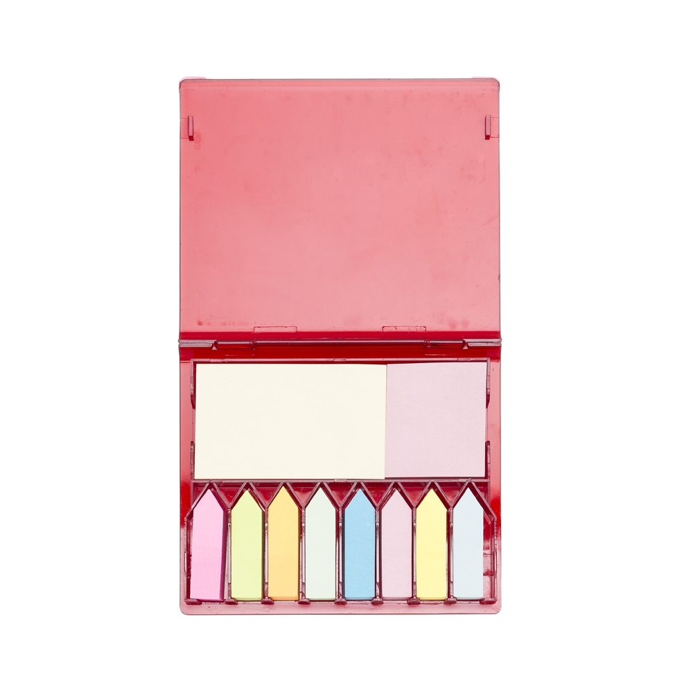 Bloco de anotações plástico inteiro colorido com autoadesivos. Possui 8 mini blocos autoadesivos com aproximadamente 100 folhas, um bloco médio com 100 folhas e bloco maior também com 100 folhas.