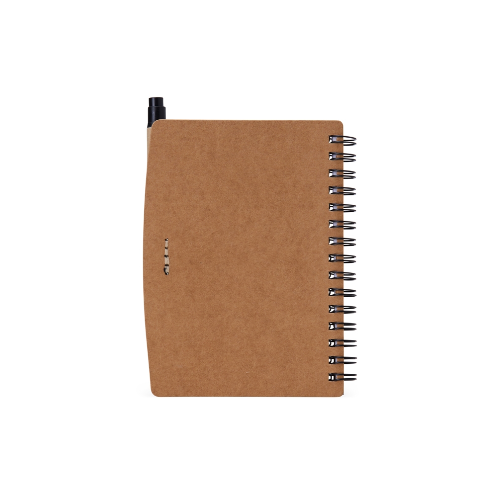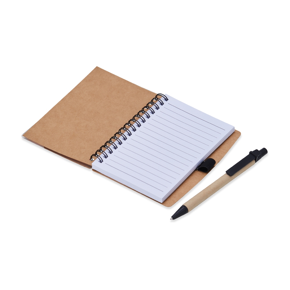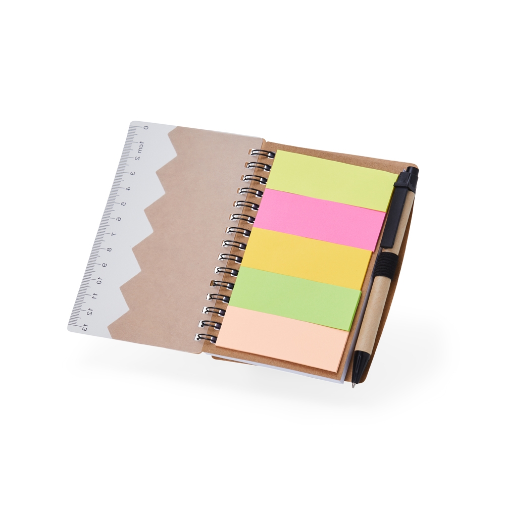 Bloco de anotações ecológico com autoadesivos, régua e caneta, feito em kraft. Contém folha com régua 13 cm, cinco autoadesivos com aproximadamente 13 folhas, bloco com aproximadamente 69 folhas brancas com pauta, porta caneta elástico e acompanha caneta de papelão com detalhes plásticos, carga esferográfica azul 1.0mm e acionamento por clique.