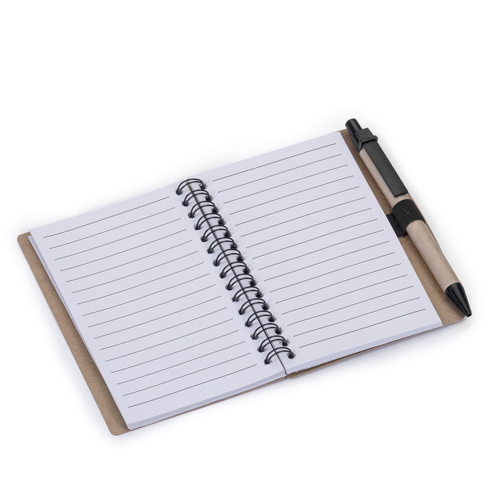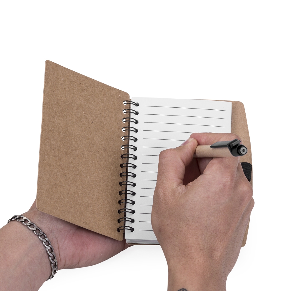 Bloco de anotações ecológico com caneta. Possui espiral preto lateral e capa lisa frente e verso, aproximadamente 70 folhas brancas pautadas e última folha papelão branco. Possui suporte elástico com caneta papelão de clip e ponteira plástica. OBS.: PEDIDO MÍNIMO DE 60 PEÇAS!