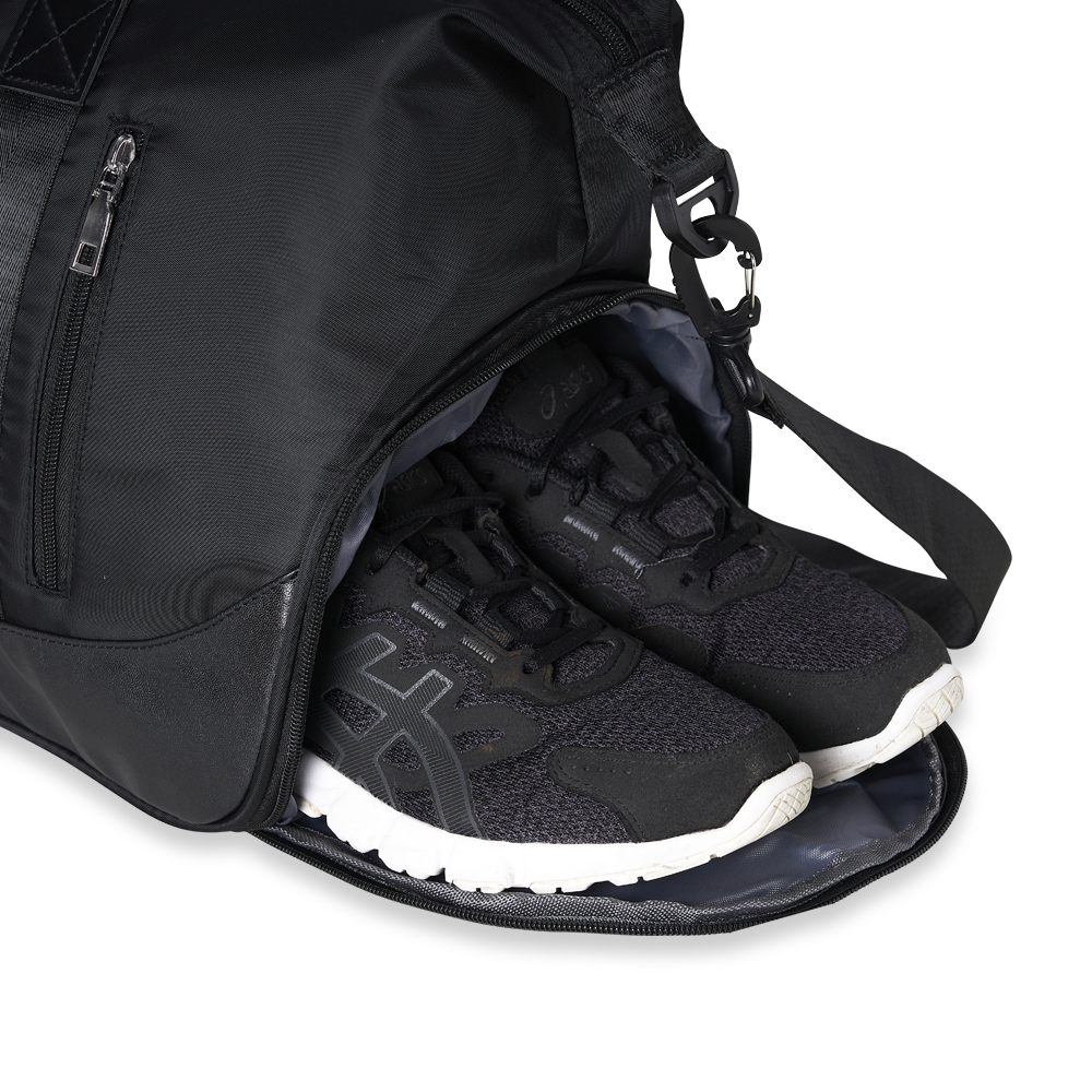 Bolsa esportiva de 28 litros em poliéster à prova dágua com quatro compartimentos, sendo dois deles exclusivos para tênis e itens molhados. Contém bolso para encaixe em malas de viagem, bolso interno e acompanha alça transversal.