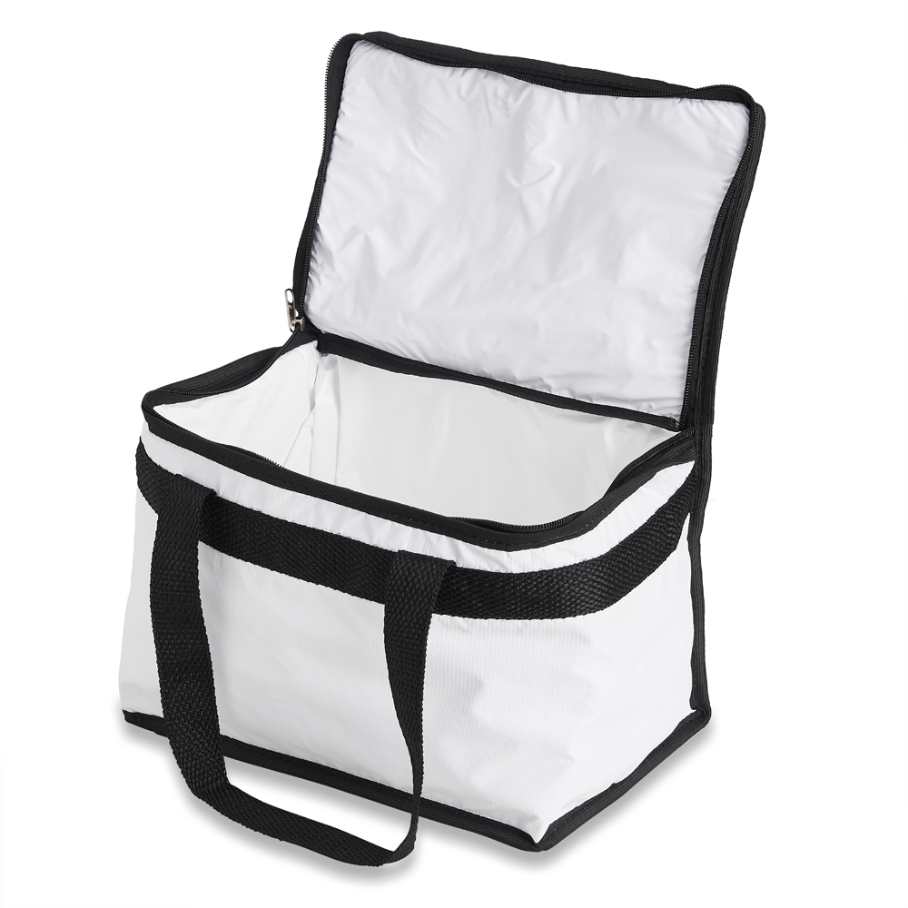 Bolsa térmica 13 litros confeccionada em bagum sintético, contém revestimento interno em polietileno atóxico soldado (não vaza) e alça para mãos em polipropileno.
