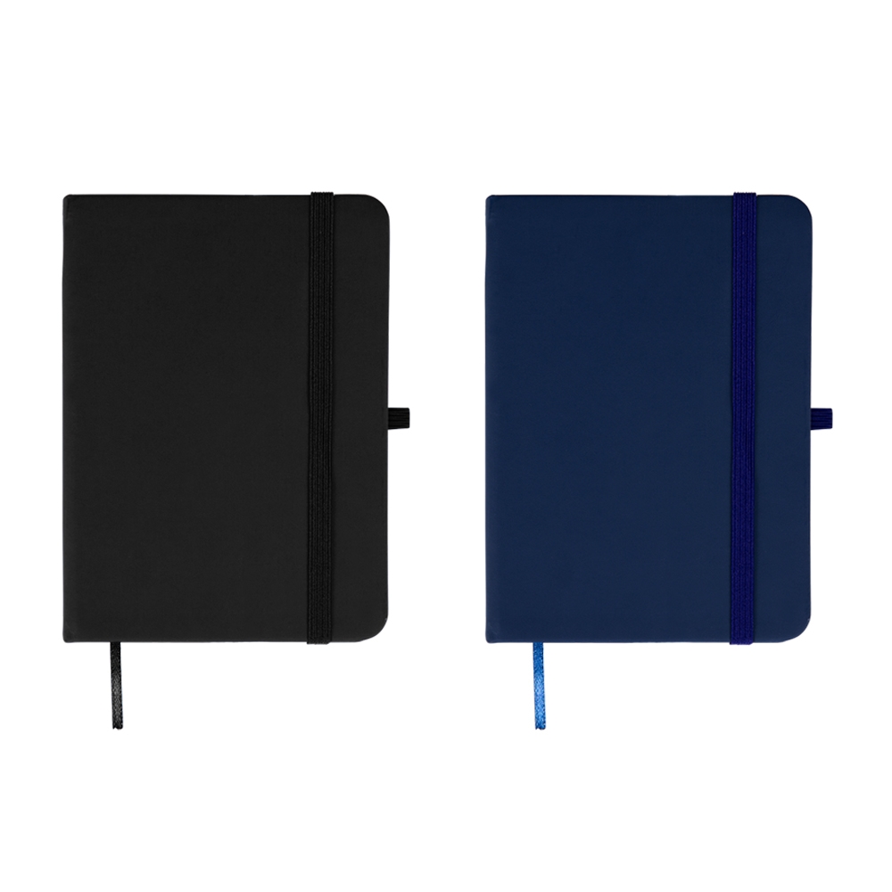 Caderneta emborrachada com elástico para lacre, marcador de página em cetim e porta caneta, contém aproximadamente 84 folhas marfim com pauta.