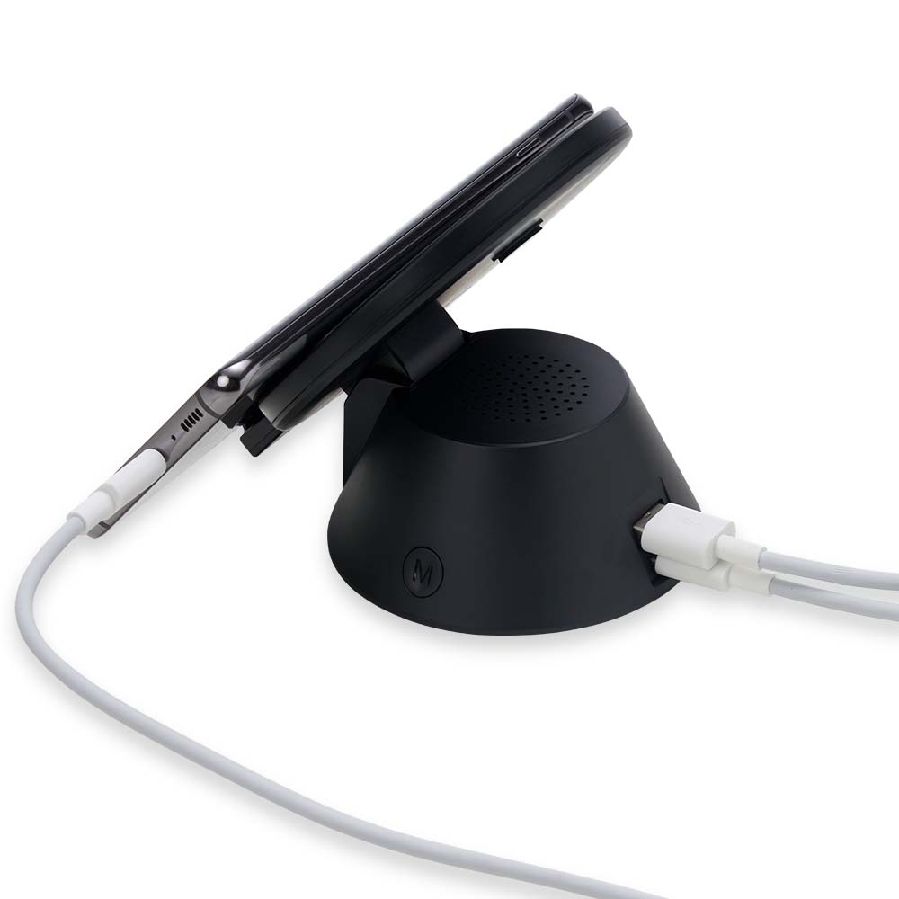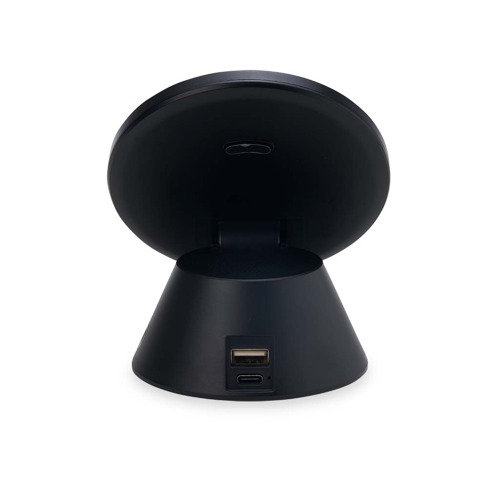 Caixinha de Som bluetooth com carregador por indução. Produzido em material plástico, a caixinha possui antiderrapantes emborrachados na parte inferior, ao ser inclinado o produto também pode ser utilizado como suporte para o celular. Para desfrutar do carregamento por indução (sem fio) é fundamental que o celular possua a tecnologia QI ? desta maneira é possível carregar o celular posicionando-o sob carregador, sendo necessário apenas conectar o carregador à uma fonte de energia (USB ou diretamente na tomada). Acompanha cabo USB Tipo-C.