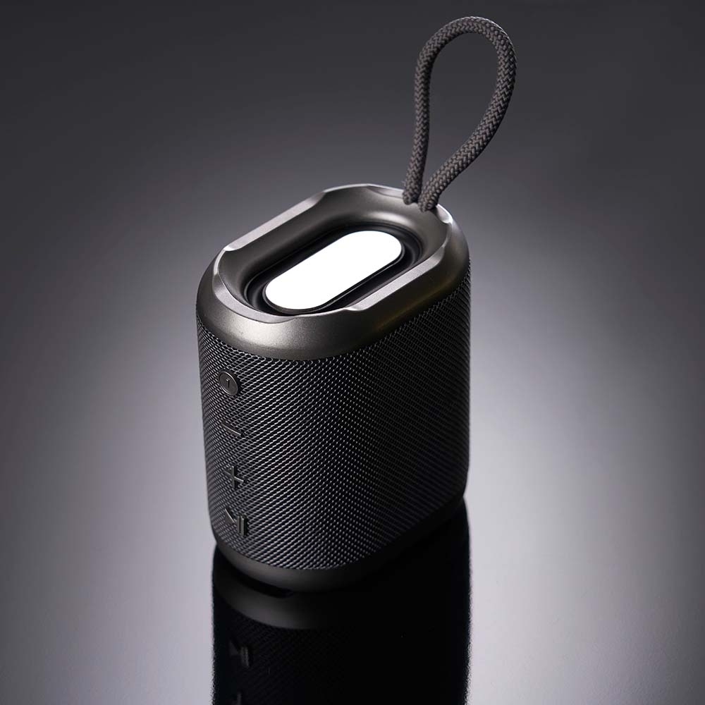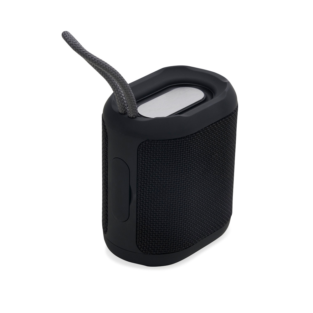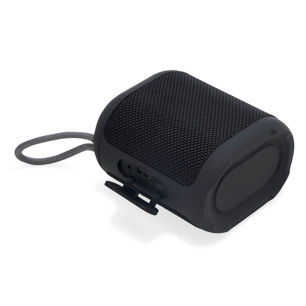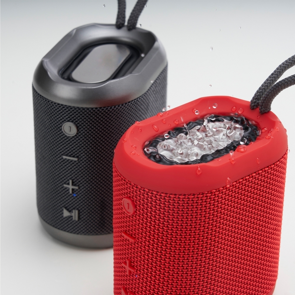 Caixa de som multimídia. Material plástico resistente a água, e falantes com acabamento em tecido, possui um cordão de nylon acoplado para facilitar o transporte. A caixinha funciona nos modos Bluetooth, Radio FM, Cartão TF (Micro SD), Auxiliar e USB. Possui bateria de longa duração, com autonomia de aproximadamente 35 horas continuas de reprodução. É possível emparelhar 2 caixinhas do mesmo modelo e executar o som sincronizado em ambas. Acompanha cabo USB e cabo auxiliar P2