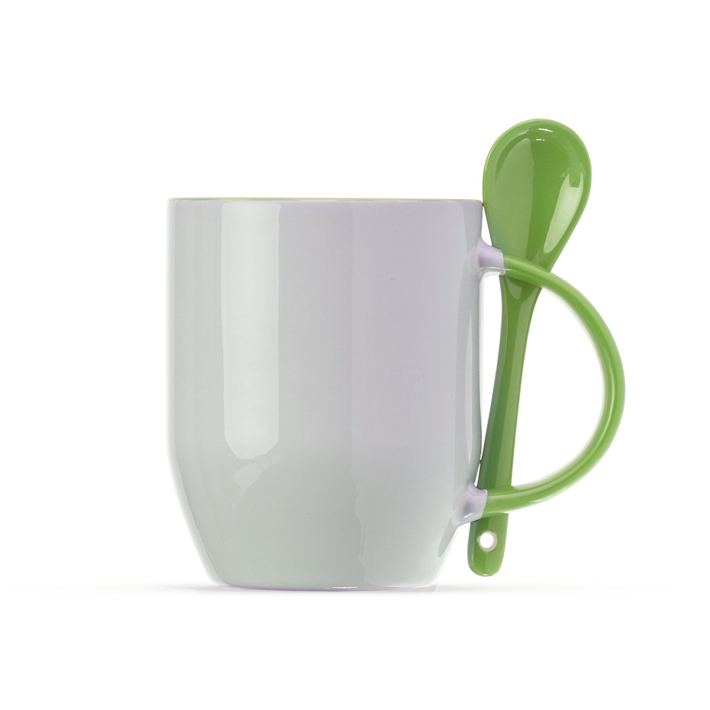 Caneca de cerâmica 350ml acompanha colher. Caneca branca com parte interna colorida, cabo colorido com detalhe vazado na parte superior, para encaixar colher. Acompanha colher cerâmica colorida com detalhe vazado no cabo.