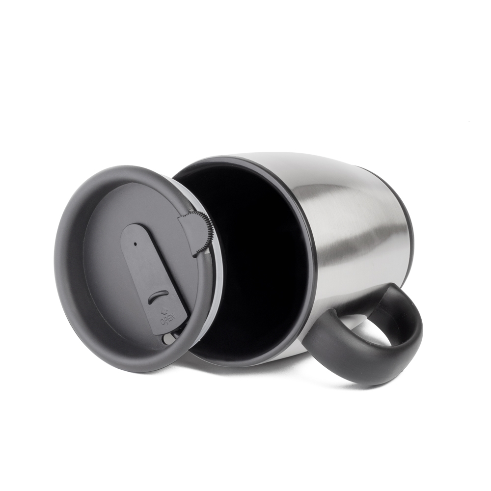 Caneca em inox de 470ml. Possui tampa com vedação, bocal com trava de segurança e pegador de plástico.