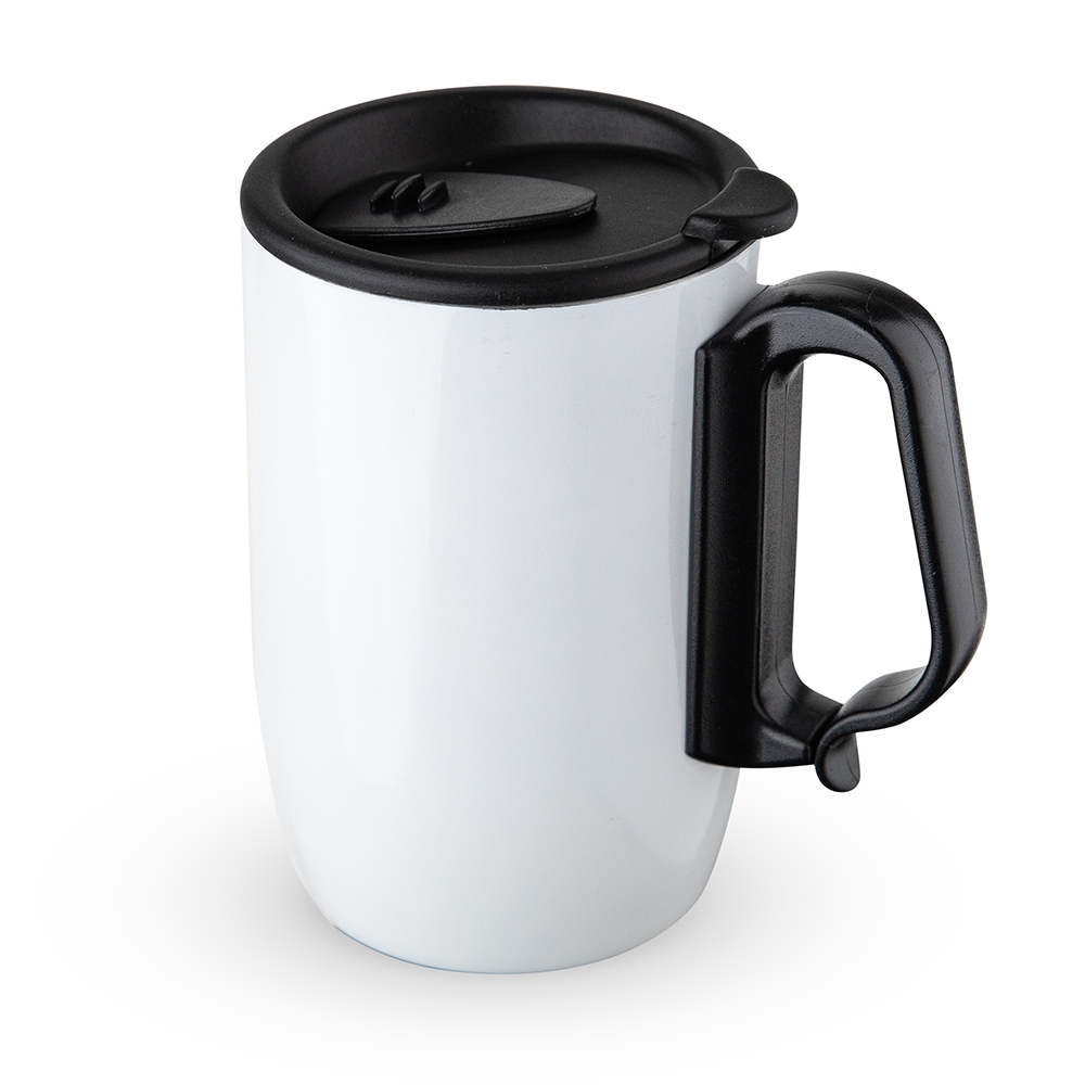 Caneca 350 ml parede dupla em Inox, com pegador de plástico, contém tampa com compartimento que ao deslizar, pode ser aberto para beber e base com EVA antiderrapante.