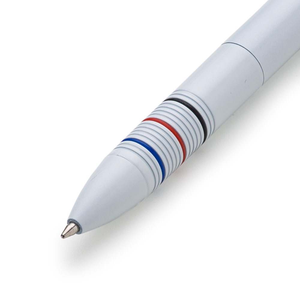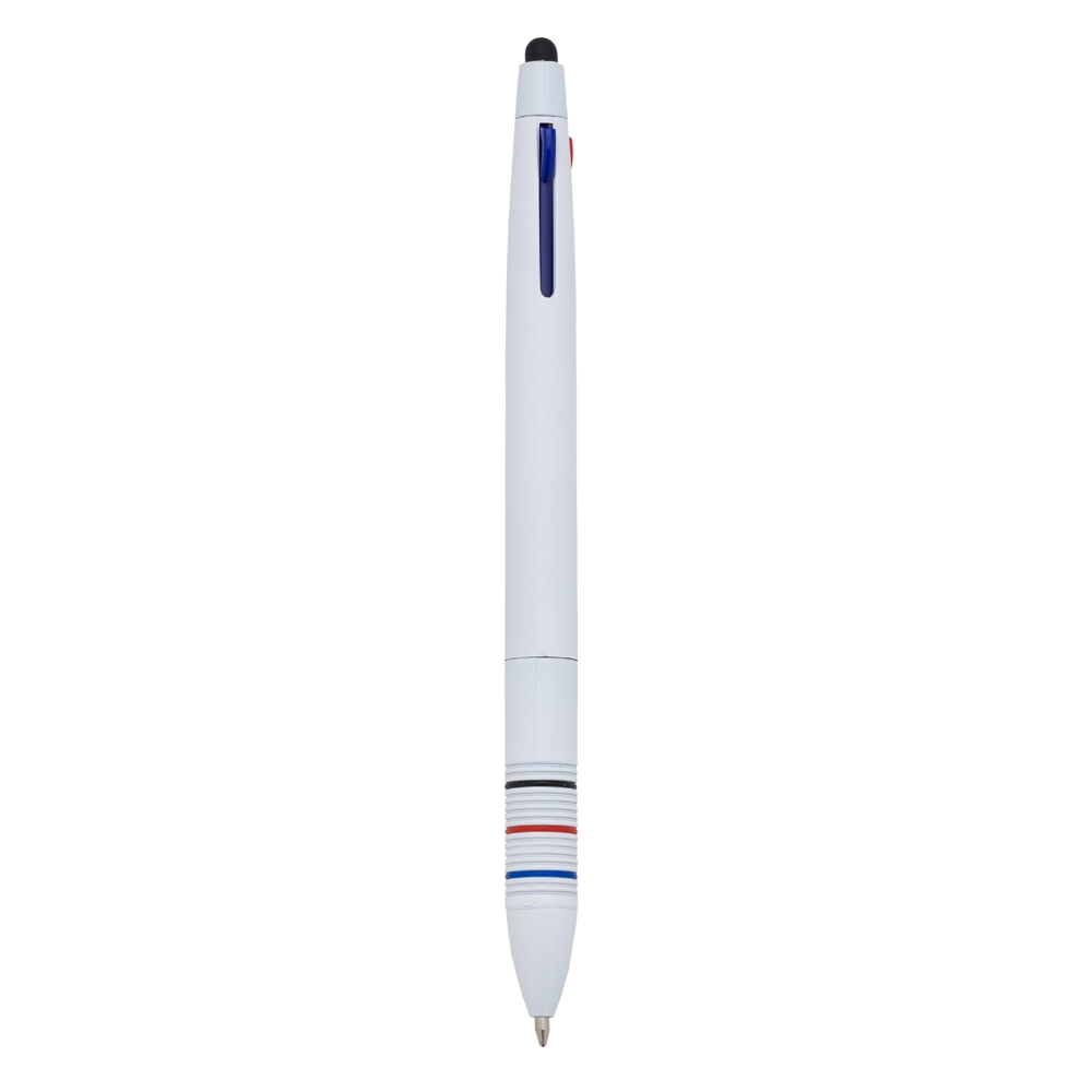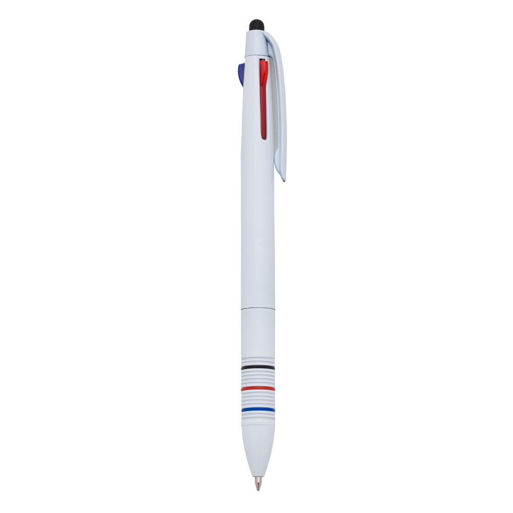 Caneta plástica 3 em 1 com touch screen, cargas esferográficas nas cores: azul, preto e vermelho.