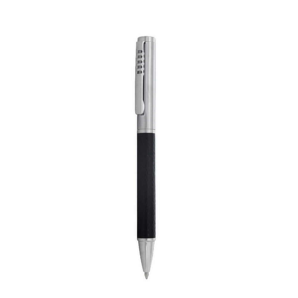 Caneta metálica com carga esferográfica azul e acionamento por rotação.