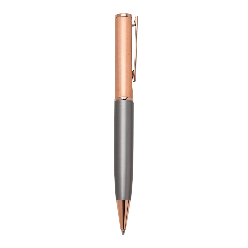 Caneta metal cobre com detalhe inferior colorido. Clip metal com e detalhe circular na ponta superior, possui anel central e aciona por giro. OBS.: PEDIDO APENAS MÚLTIPLO DE 50 PEÇAS!