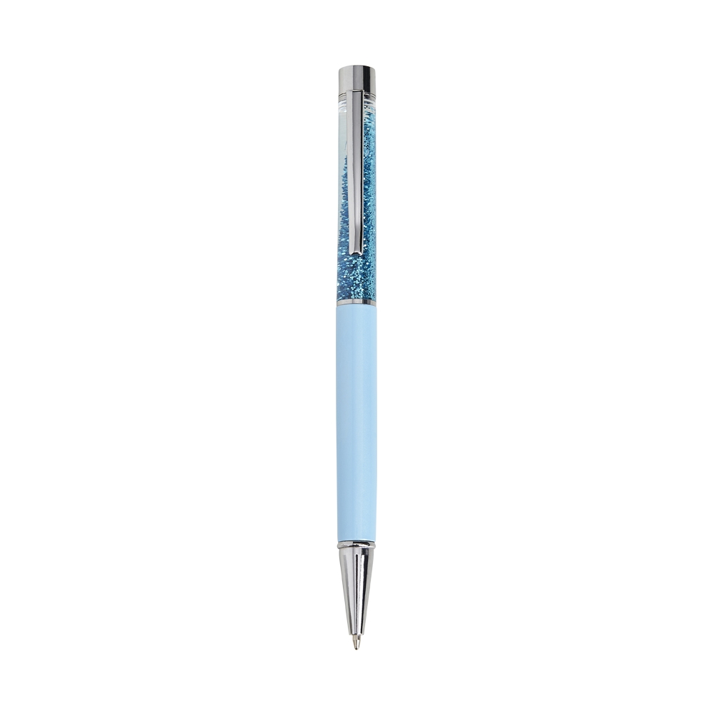 Caneta metálica com glitter, acionamento por rotação e carga esferográfica 1.0mm azul.