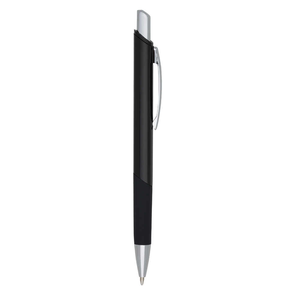 Caneta metálica com design quadrangular, acabamento brilhante (exceto a prata) e detalhe emborrachado, carga esferográfica azul e acionamento por clique.