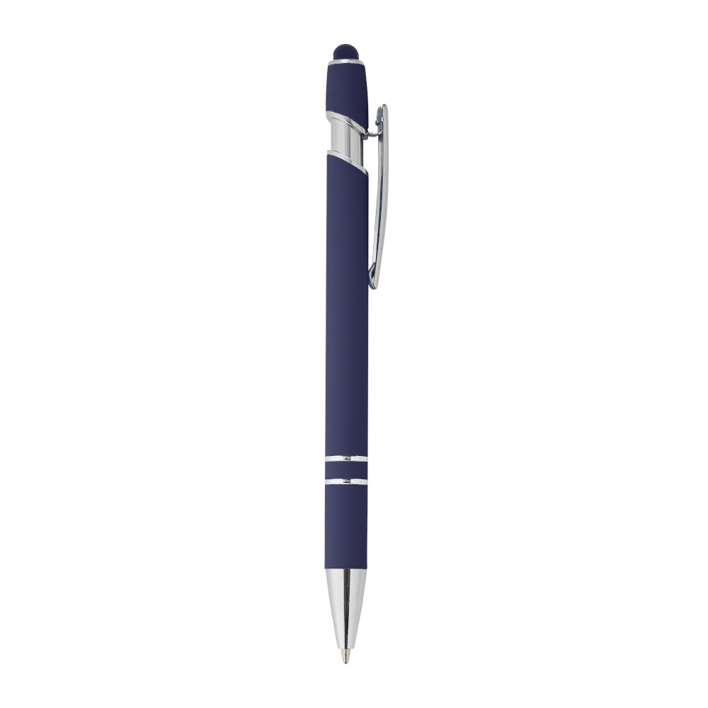 Caneta metálica touchscreen com acabamento similar à borracha, acionamento por clique e carga esferográfica azul 1.0mm.