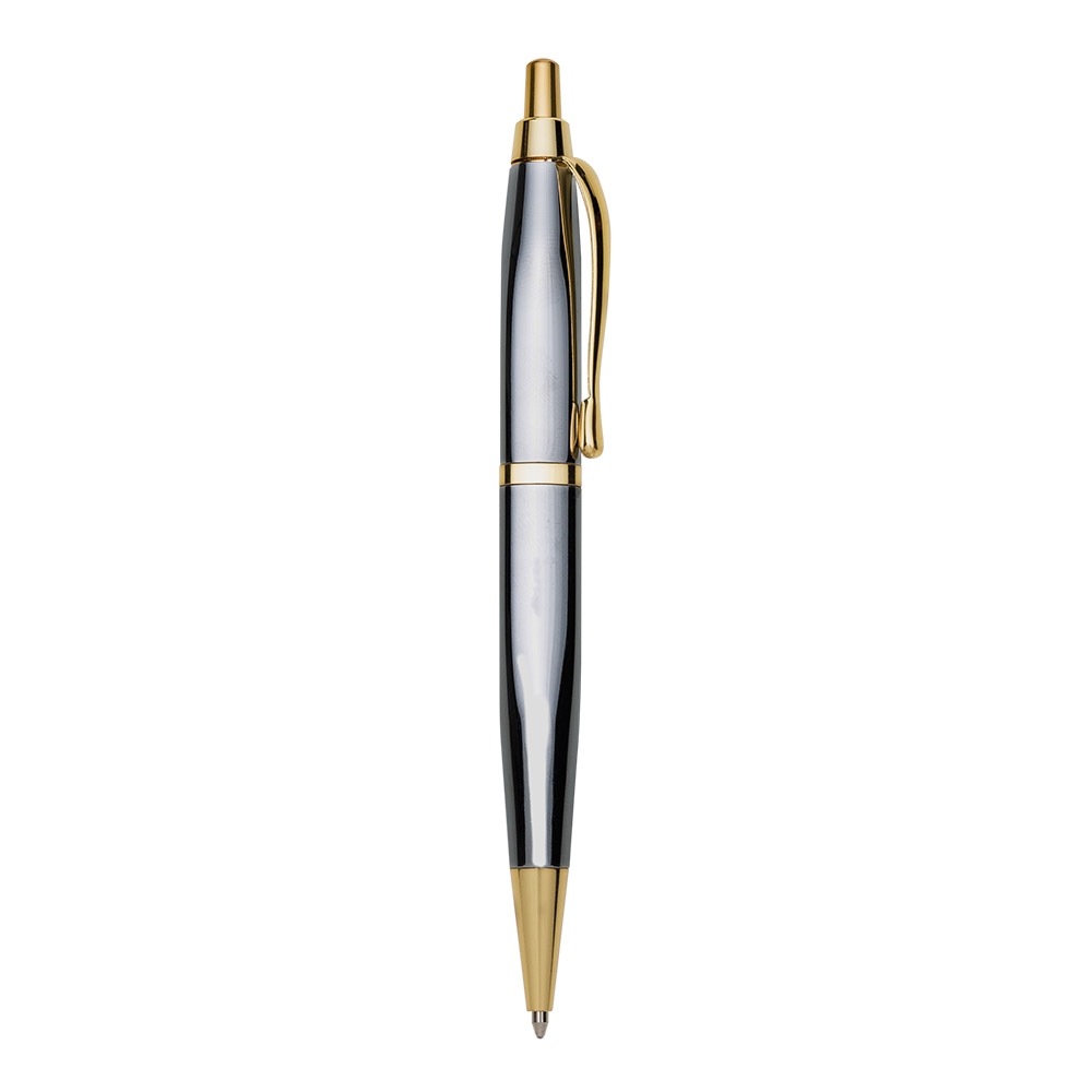 Caneta metal triangular com pintura colorida e detalhes dourados. Clip metálico, acionador, anel e ponteira dourada. Aciona por clique. OBS.: PEDIDO APENAS MÚLTIPLO DE 50 PEÇAS!