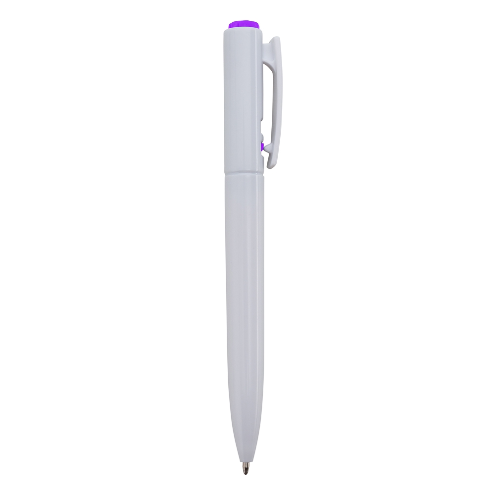 Caneta plástica com carga esferográfica azul e acionamento por clique.