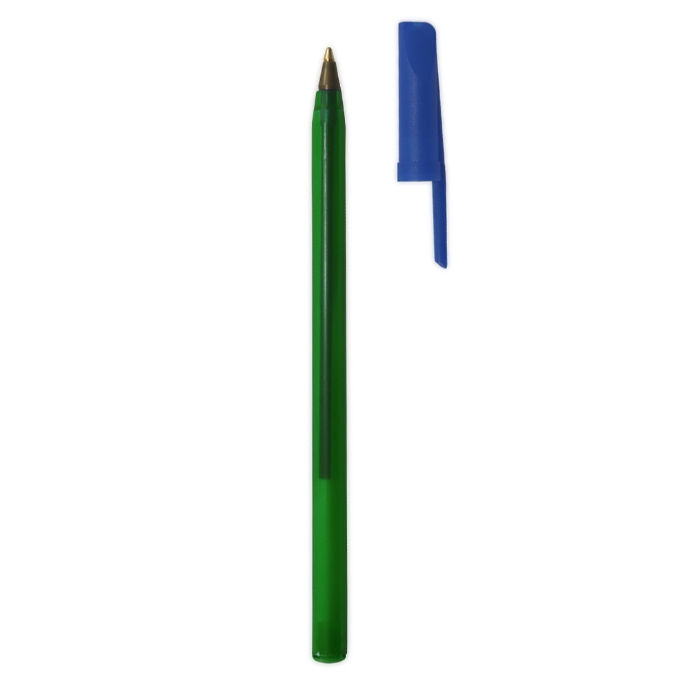 Caneta plástica com tampa. Carga esferográfica azul. Possível solicitar diversas combinações de cores de tampa e corpo da caneta. Consulte seu(a) vendedor(a).