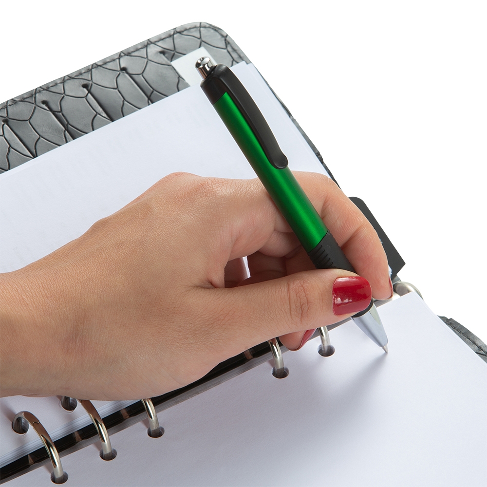 Caneta plástica com detalhe emborrachado, carga esferográfica azul e acionamento por clique.