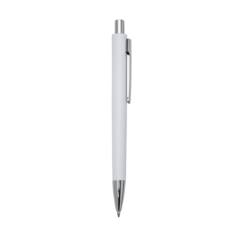 Caneta semimetálica com carga esferográfica azul e acionamento por clique.