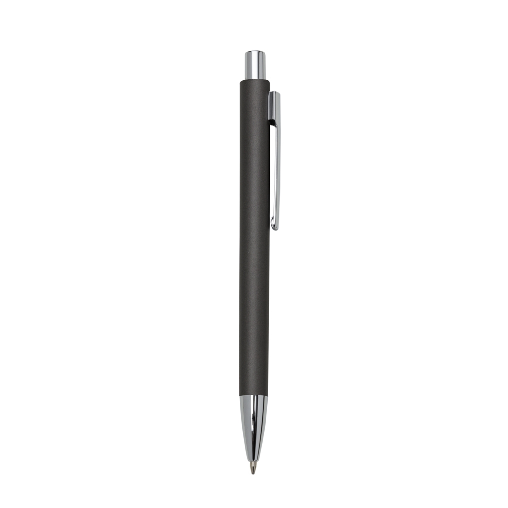 Caneta semimetálica com carga esferográfica azul e acionamento por clique.