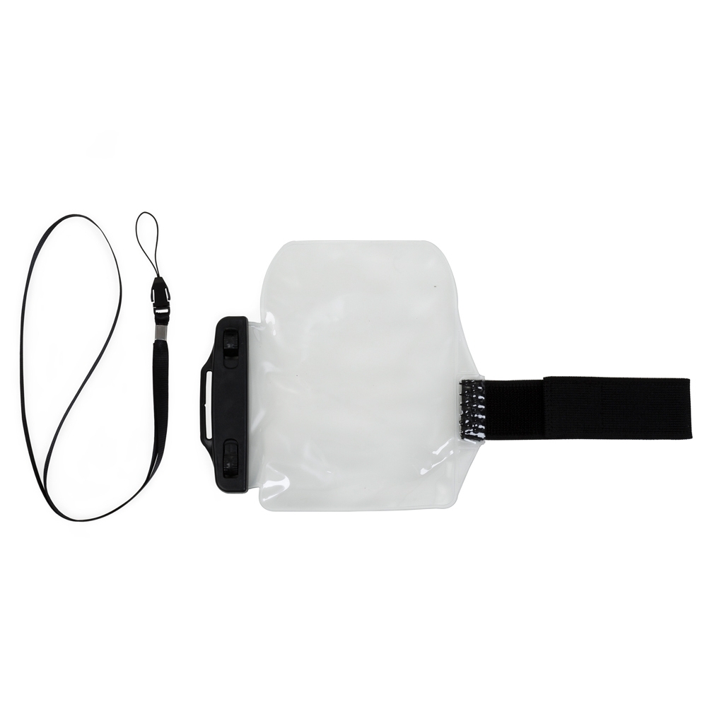 Capa braçadeira impermeável para celular. Parte frontal transparente e verso fosco, suporte plástico superior com fivelas rotatórias(basta rotacioná-las para abrir o case). Possui na lateral fita elástica com velcro para e acompanha cordão de cetim.