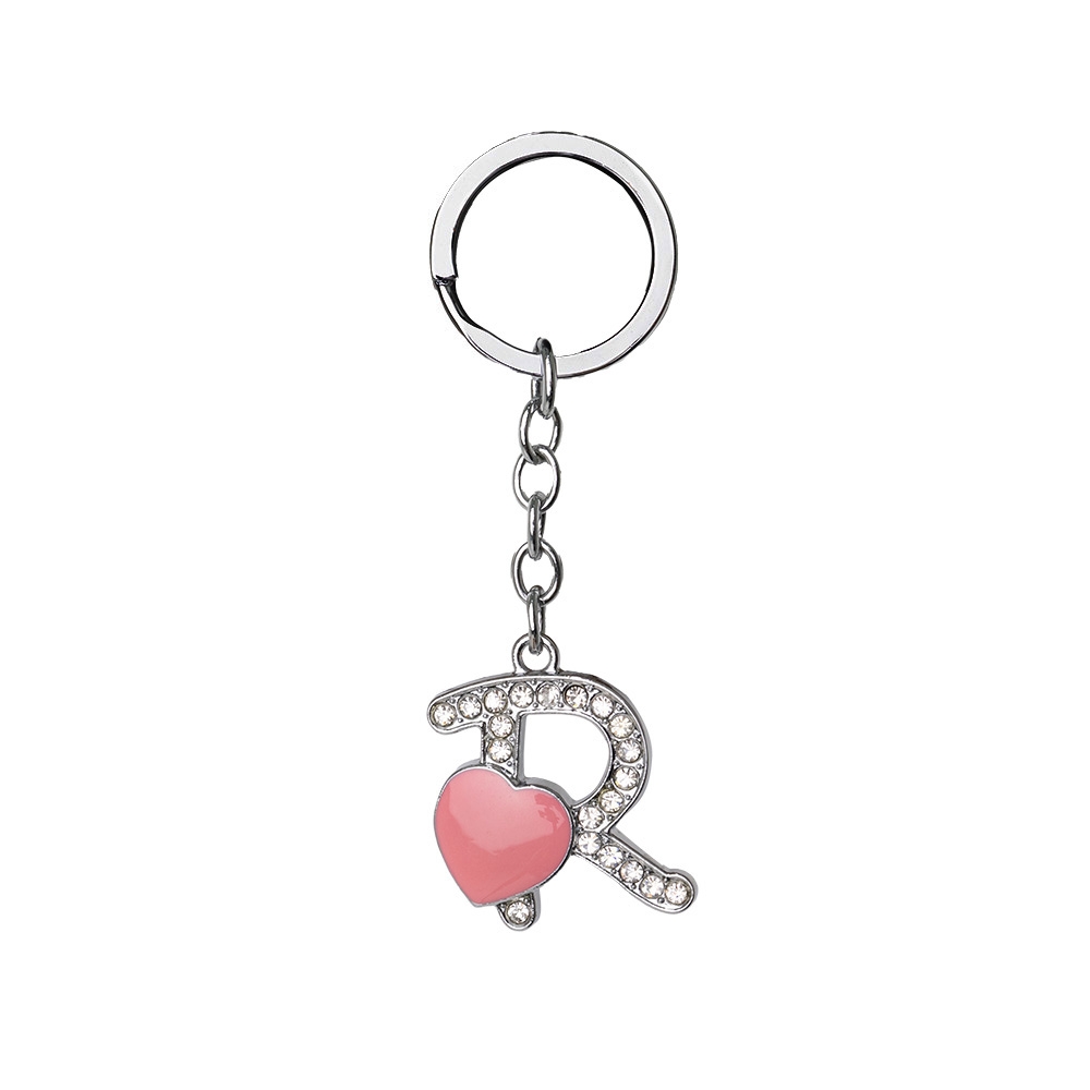 Chaveiro de metal, formato de letra, com pedras brilhantes e detalhe em coração.