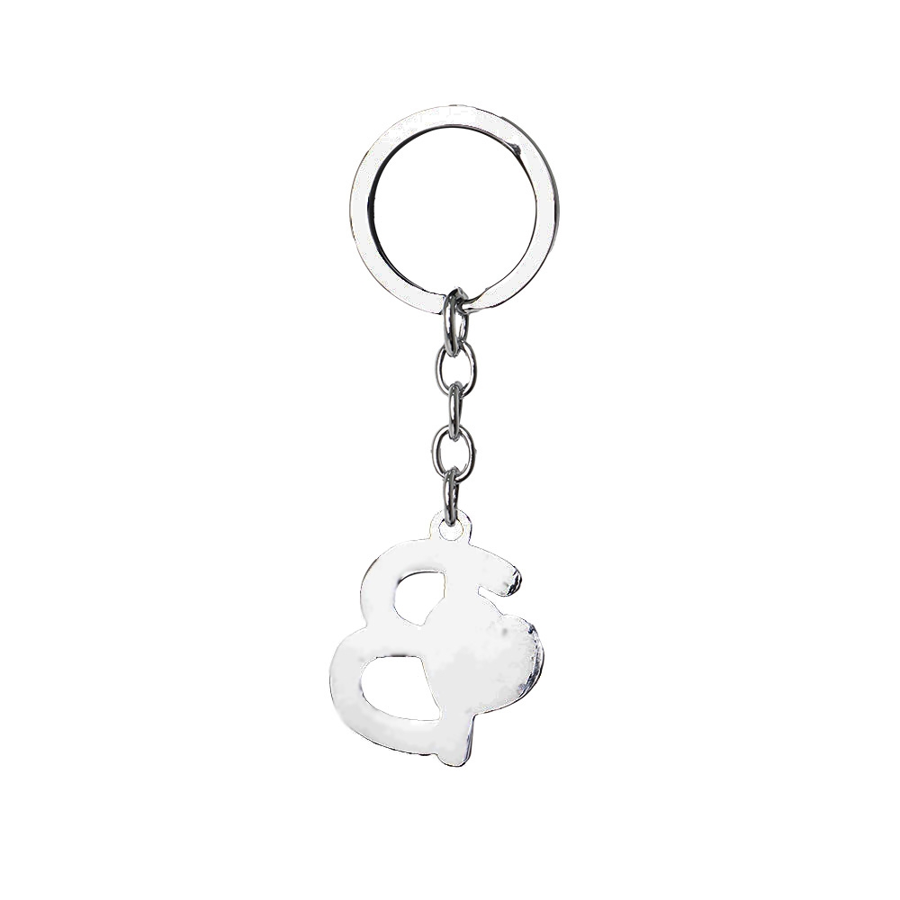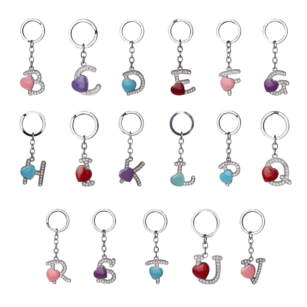 Chaveiro de metal, formato de letra, com pedras brilhantes e detalhe em coração.