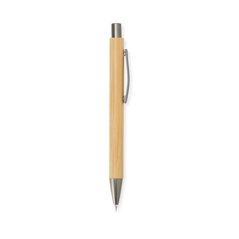 Conjunto caneta e lapiseira de bambu em estojo de papel. Caneta esferográfica azul 1.0mm com borracha touch, clipe metálico e acionamento por clique lapiseira 0.7 com clipe metálico.