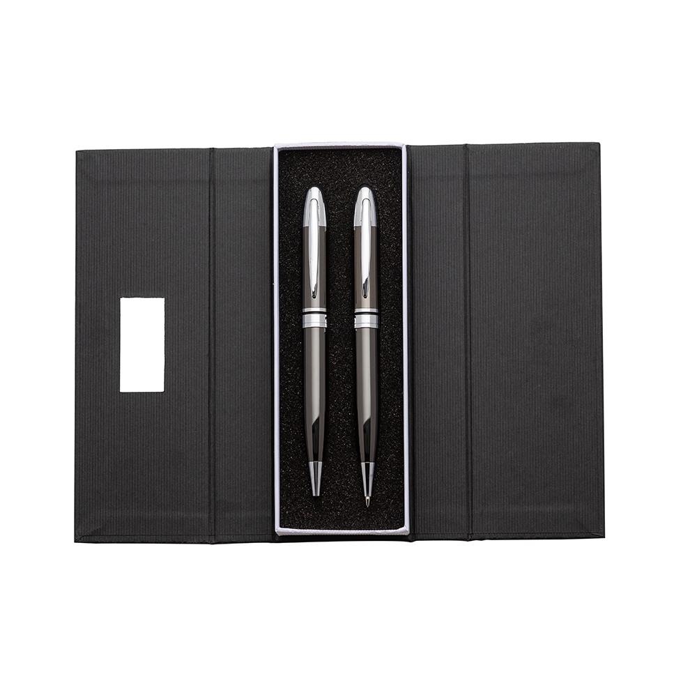 Conjunto caneta e lapiseira em estojo de cartonagem com placa central para personalização. Clip metal e anel central possui: anel fino prata, anel preto fino e um anel maior prata com relevo e acionam por giro. Estojo revestida com espuma na parte interna.