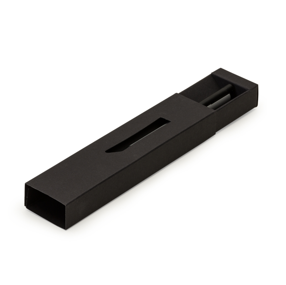 Estojo de papel para uma caneta, possui um visor vazado na capa. Parte interna do estojo tem formato triangular.