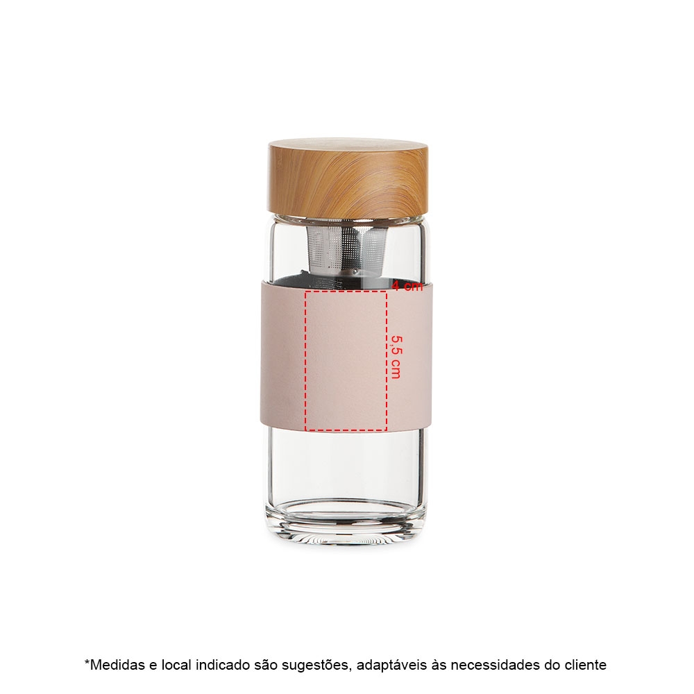 Garrafa de vidro borossilicato com capacidade de 400ml, acompanha infusor e luva de tecido sintético. Tampa plástico com design de bambu.