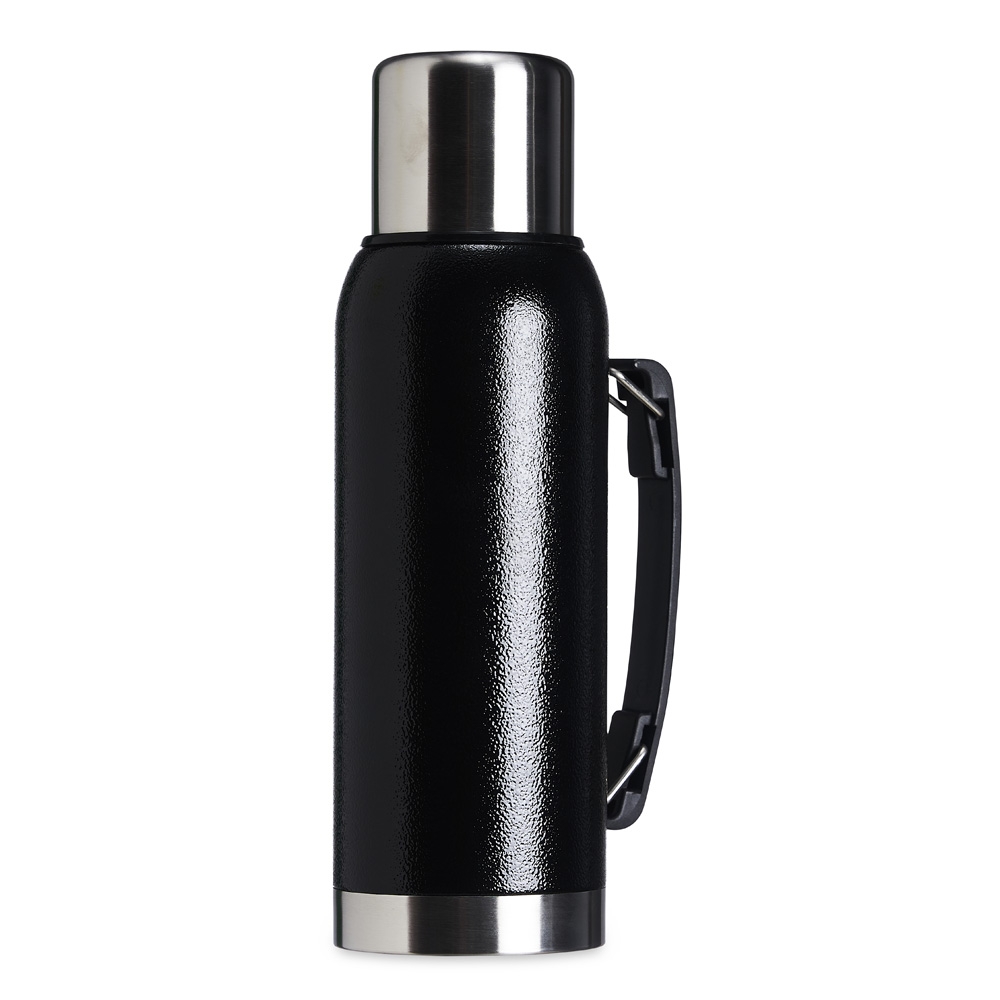 Garrafa térmica de inox livre de BPA com capacidade de 1 litro. Contém alça para transporte.