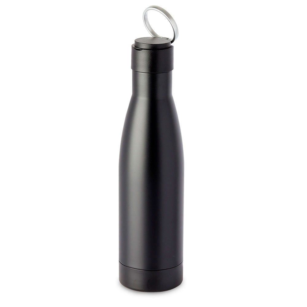 Garrafa térmica feita em inox 304 de parede dupla com capacidade de 500ml, tampa plástica com alça para transporte.