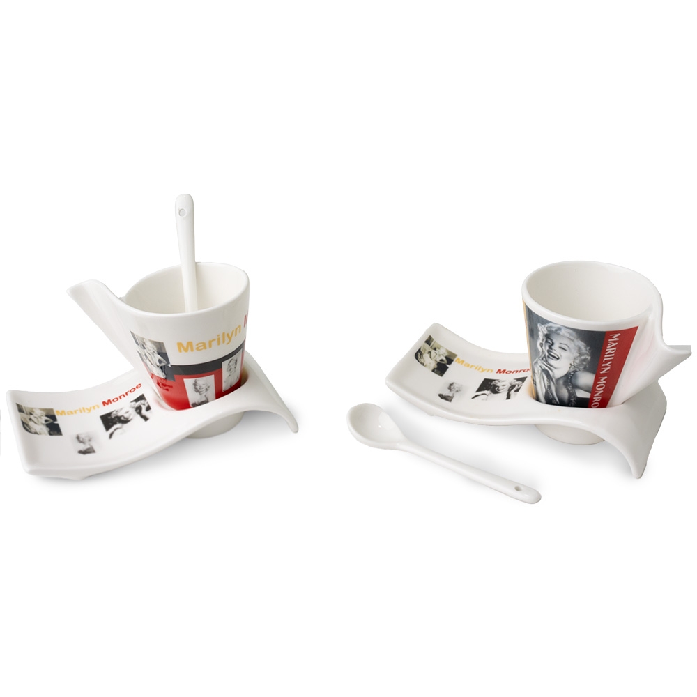 Kit de café com duas xícaras de 80ml cada, acompanhadas por dois pires e duas colheres.