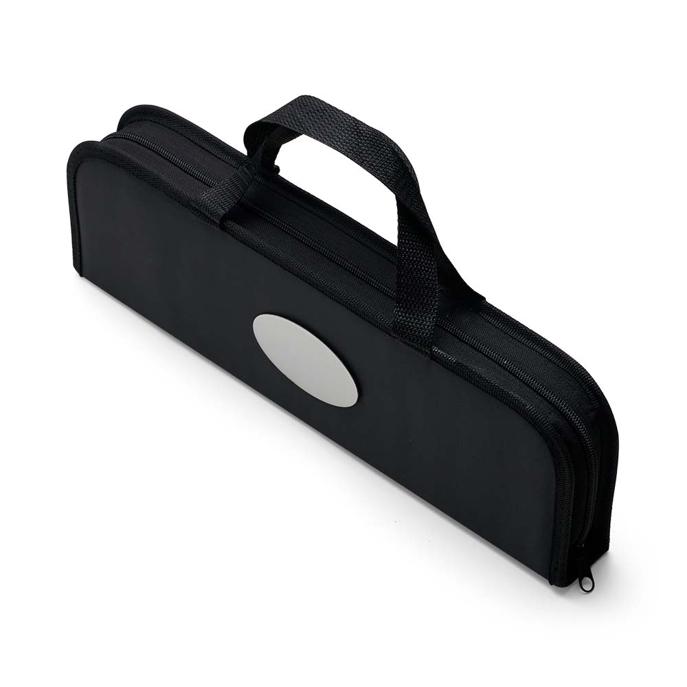 Kit Churrasco 17 Peças em estojo de nylon com alça. Contém: pegador, garfo, espátula, faca, pincel, 4 espetos e 8 garfos pequenos para petiscos. Utensílios de inox com proteções plásticas e parte interna com velcro para fixação das peças, acompanha plaquinha metálica para personalização.