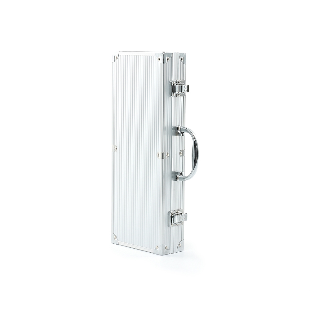 Kit churrasco 5 peças em maleta de alumínio com travas de segurança, contém três facas de corte, tesoura e chaira. Parte interna da maleta com revestimento em tnt e suportes de velcro para fixação das peças.
