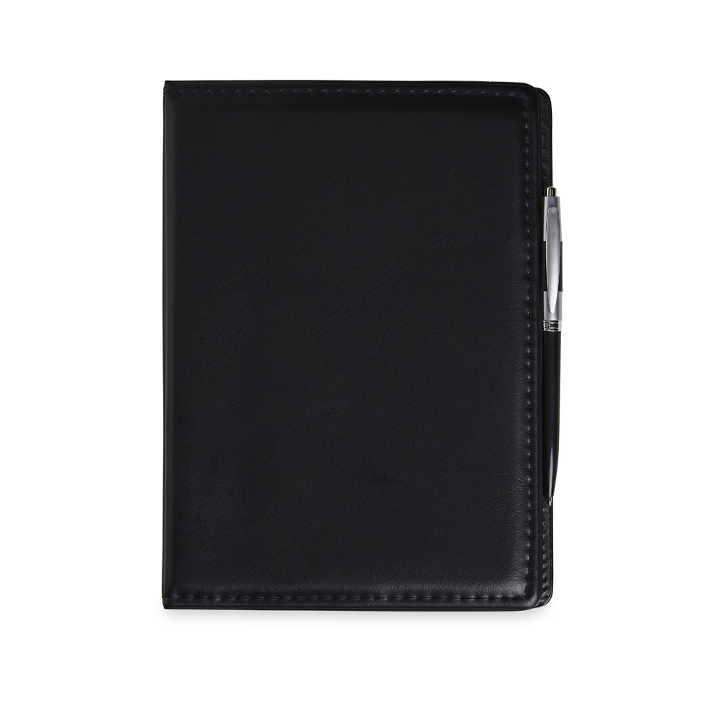 Kit para anotações em couro sintético com autoadesivos e caneta plástica. Contém seis blocos com aproximadamente 50 folhas, conjunto de cinco marcadores plásticos autoadesivos com aproximadamente 26 folhas, bloco A5 com aproximadamente 50 folhas e caneta esferográfica com carga azul e acionamento por clique.