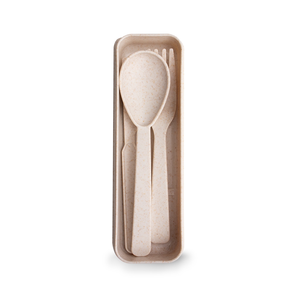 Kit de talheres em fibra de trigo. Contém três peças: garfo, faca e colher, acompanhadas de estojo com tampa de encaixe.