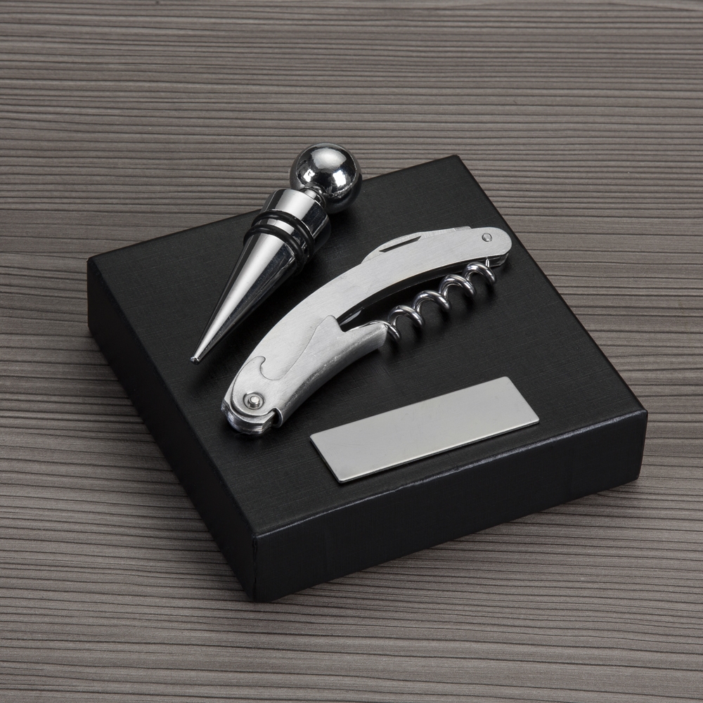 Kit vinho 2 peças em estojo com tampa, contém saca-rolhas metálico com lâmina de corte e abridor de garrafa e tampa de bico. Área interna do estojo com berço de espuma. Acompanha plaquinha metálica para personalização.