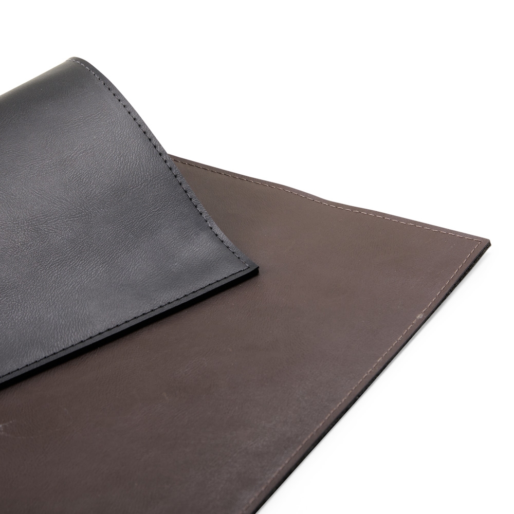 Lugar Americano dupla face, couro sintético. Sendo uma face na cor preto e a outra na cor marrom.