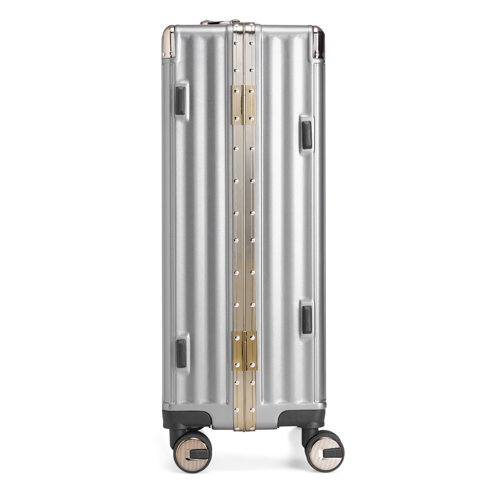 Mala de viagem 68 litros feita em plástico com acabamento em alumínio, contém cadeado numérico TSA. Compartimentos internos com bolso telado, bolso plástico para itens molhados e cinta compressora para roupas. A mala possui duas alças de mãos, puxador retrátil com regulagem de tamanho, suporte porta bolsa, quatro rodinhas 360º e apoios laterais.