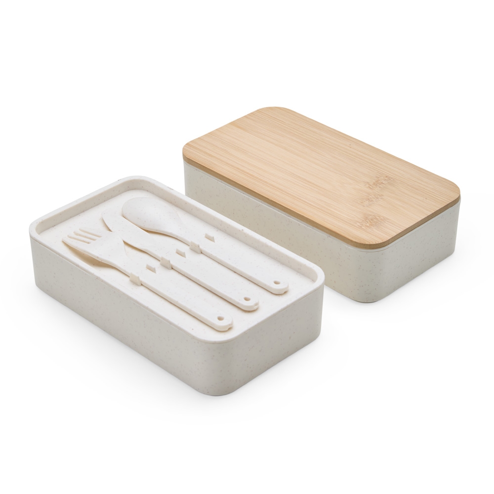 Marmita dupla em fibra de trigo livre de BPA, sendo um compartimento de 600ml com tampa de bambu e outro compartimento de 500ml com suporte para talheres de fibra de trigo. Possui uma divisória removível e elástico para um transporte seguro. Acompanha garfo, faca e colher. Obs: O tempo de aquecimento no micro-ondas não deve ultrapassar 3 minutos.