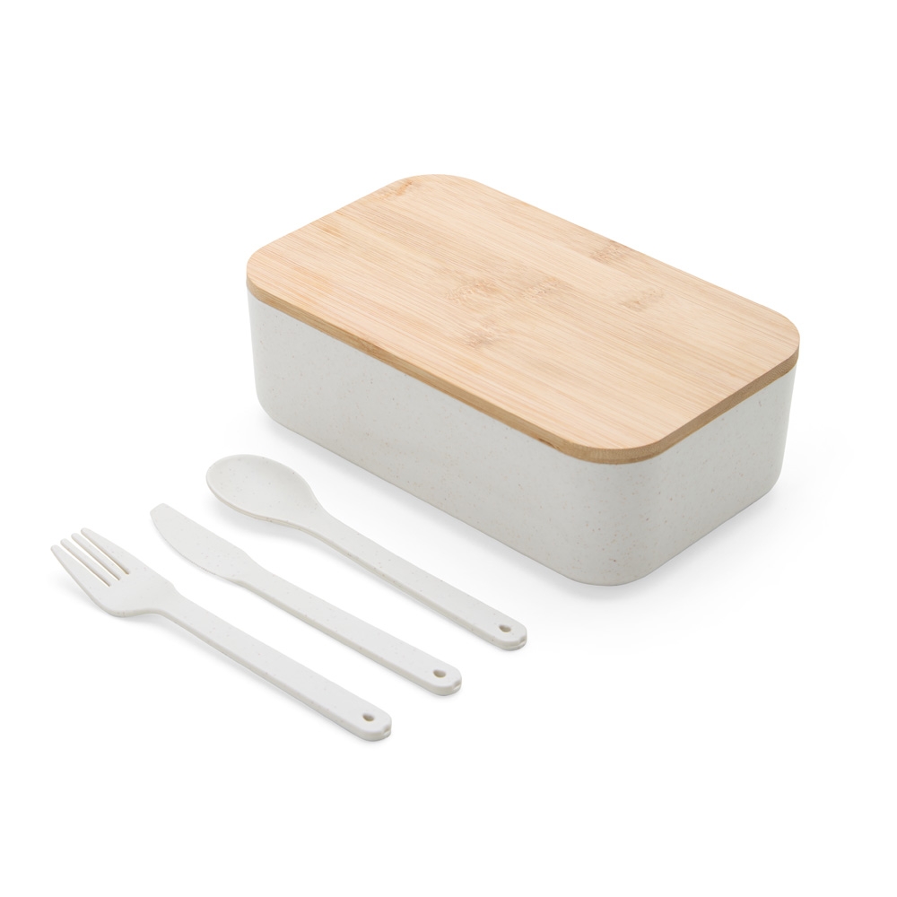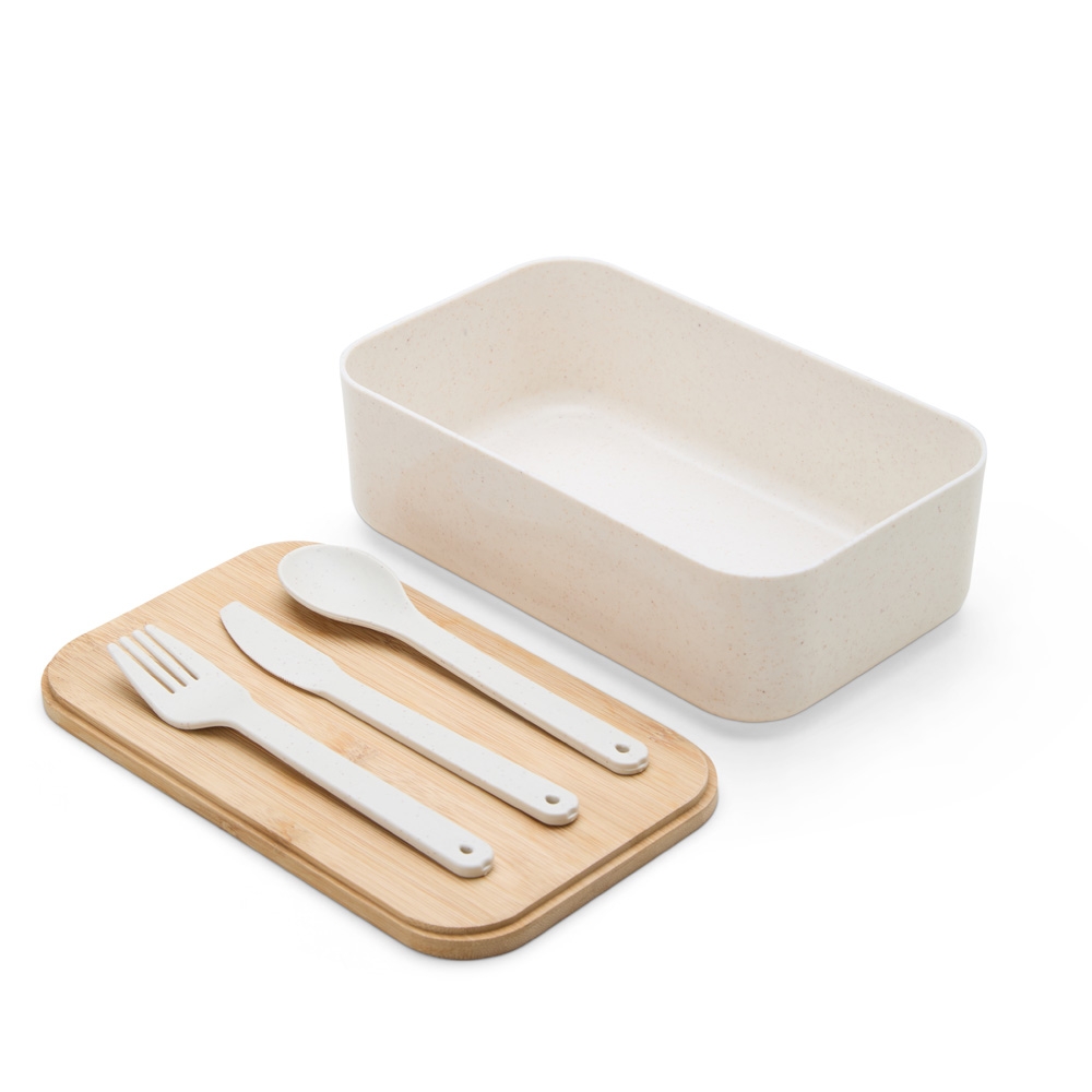 Marmita em fibra de trigo com tampa de bambu de 1 litro. Possui elástico para um transporte seguro. Acompanha garfo, faca e colher. Obs: O tempo de aquecimento no micro-ondas não deve ultrapassar 3 minutos.