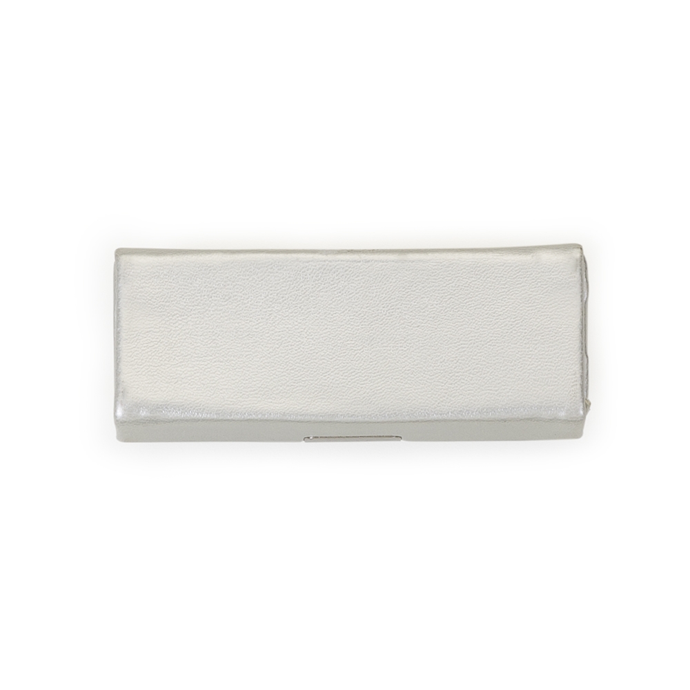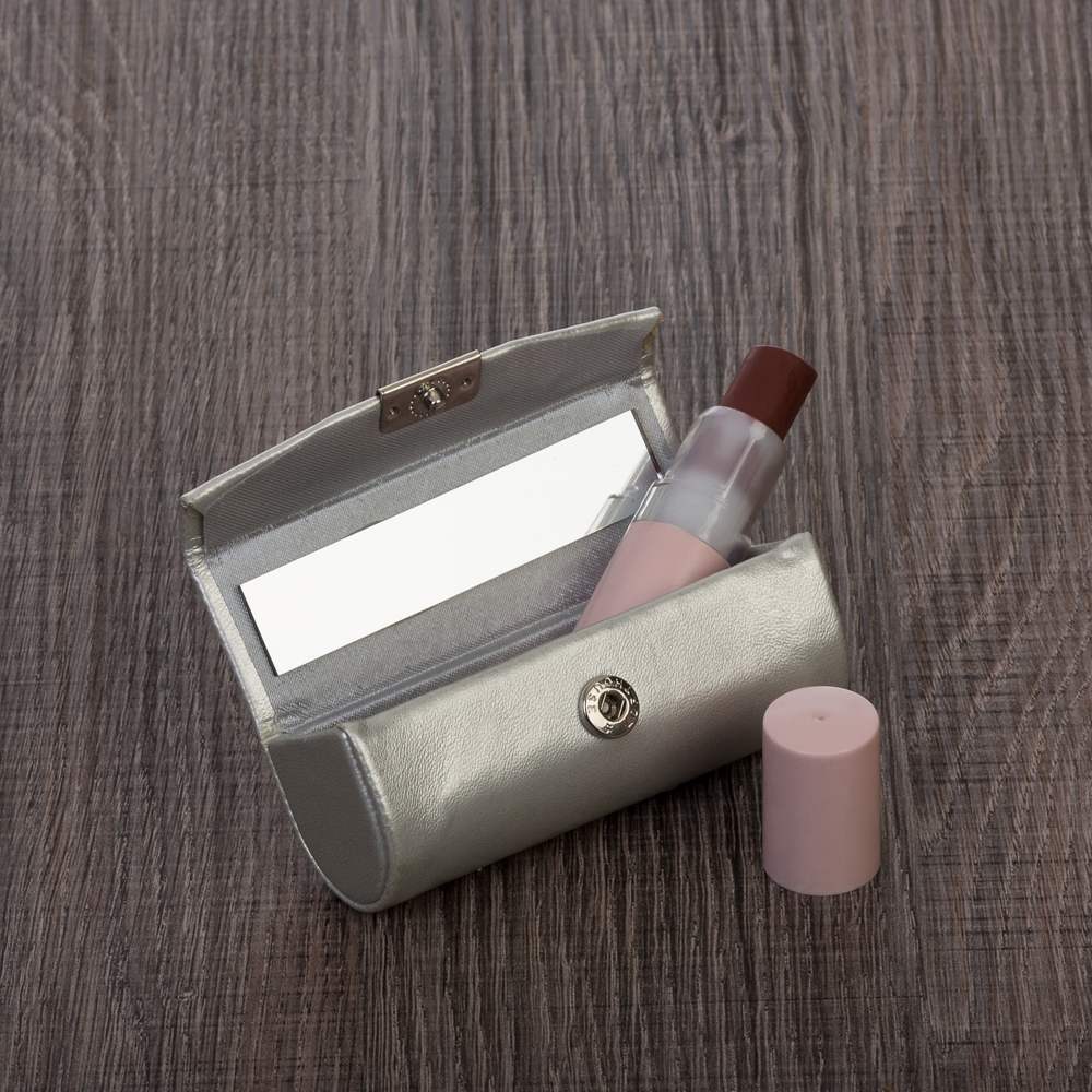 Porta batom em couro sintético prata com plaquinha de metal frontal com botão para abrir/fechar, possui um espelho interno.
