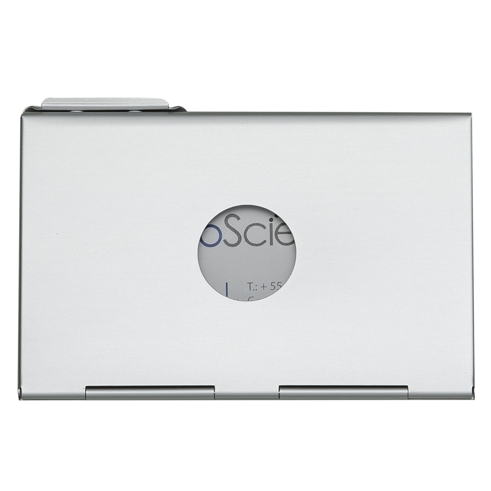Porta cartão de alumínio, design da abertura em diagonal e com um furo central vazado na parte traseira.