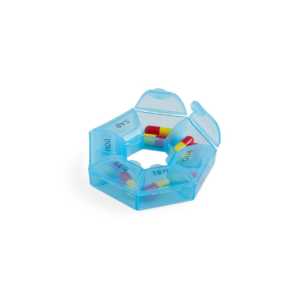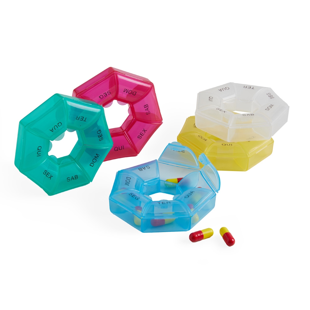 Porta comprimidos semanal, feito em plástico.