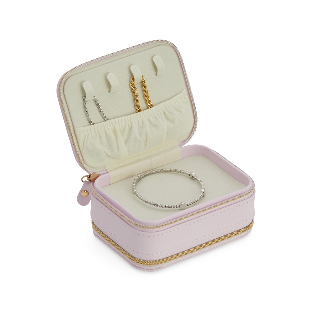 Porta joias de couro sintético com dois compartimentos de revestimento aveludado. Possui compartimento para anéis, brincos, pulseiras e colares.