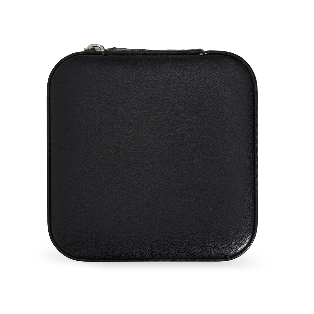 Porta joias de couro sintético com revestimento aveludado. Possui compartimentos internos para anéis, brincos, pulseiras e colares.