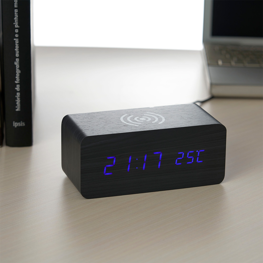 Relógio digital LED com alarme e carregamento por indução, pode ser utilizado através da fonte USB (acompanha) ou 3 pilhas AAA (não acompanha). Produzido em MDF, o relógio possui um display LED na parte frontal, área para carregamento via indução na parte superior, parte traseira com mecanismo para ajustes, entrada DC 5V e compartimento de pilhas.