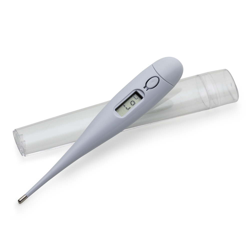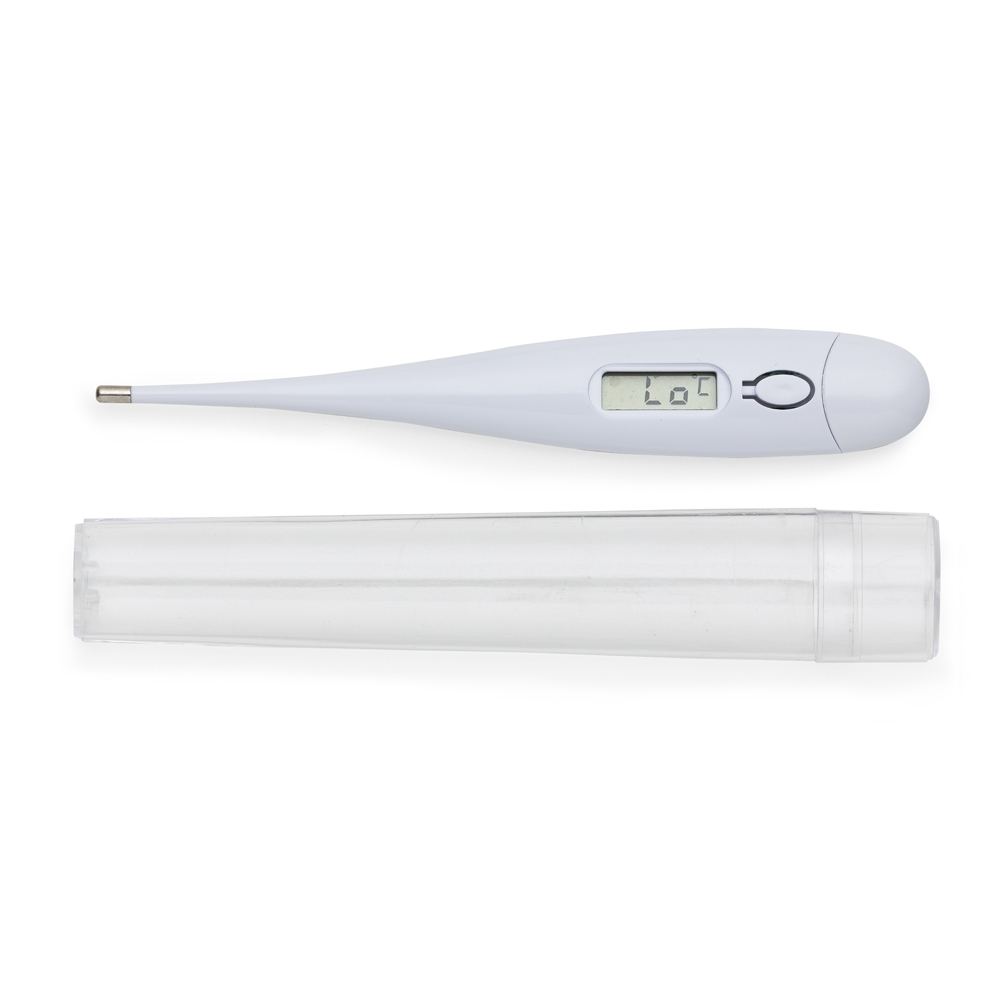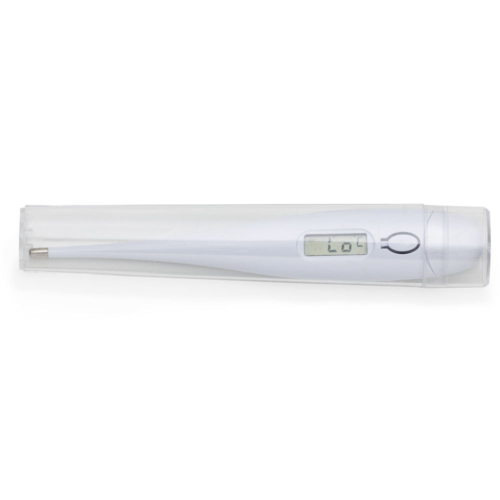 Termômetro branco digital, possui display e botão ao lado para ligar/desligar e parte traseira relevo quadrado para aplicar logo. Tampa na lateral pode ser removida para trocar bateria(acompanha uma LR41) e embalagem acrílica.